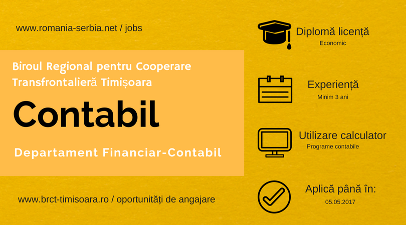 Biroul Regional pentru Cooperare Transfrontalieră Timișoara anunță organizarea unui concurs de recrutare pentru ocuparea postului de Contabil în cadrul Departamentului Financiar, Contabil și Administrativ.